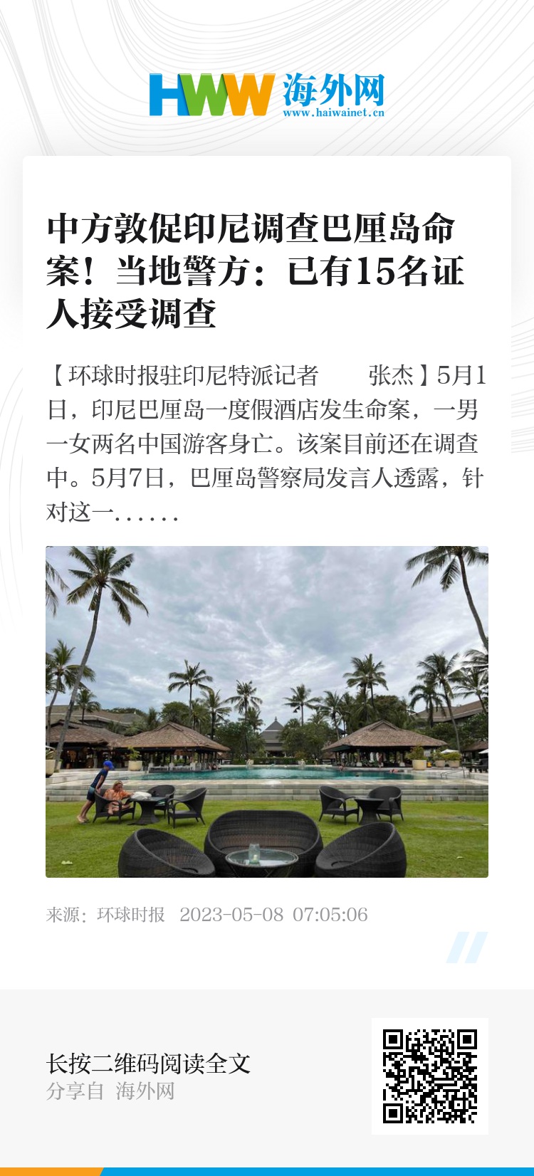 【环球时报驻印尼特派记者 张杰】5月1日,印尼巴厘岛一度假酒店发生命案,一男一女两名中国游客身亡。该案目前还在调查中。5月7日,巴厘岛警察局发言人透露,针对这一案件,已有多达15名证人接受了调查。据他介绍,这15名证人有酒店员工,以及熟悉酒店位置的外国人。