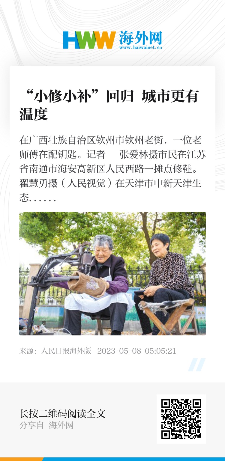 今年2月,商务部新闻发言人表示,让修鞋、配钥匙等“小修小补”规范有序回归百姓生活,引发社会广泛关注。受访专家表示,“小修小补”虽不起眼,在生活中却必不可少,与群众生活的温馨度和幸福感息息相关。近年来,各地积极推进便民生活圈建设,提升城市精细化治理水平,为百姓生活带来更多实惠与便利。