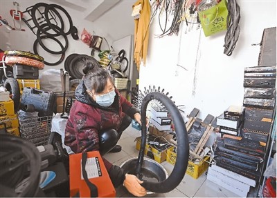 在天津市中新天津生态城第三社区中心,一家自行车修理店经营者正在检修轮胎。新华社记者 赵子硕摄