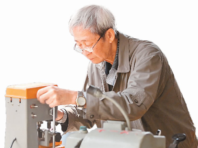 在广西壮族自治区钦州市钦州老街,一位老师傅在配钥匙。新华社记者 张爱林摄