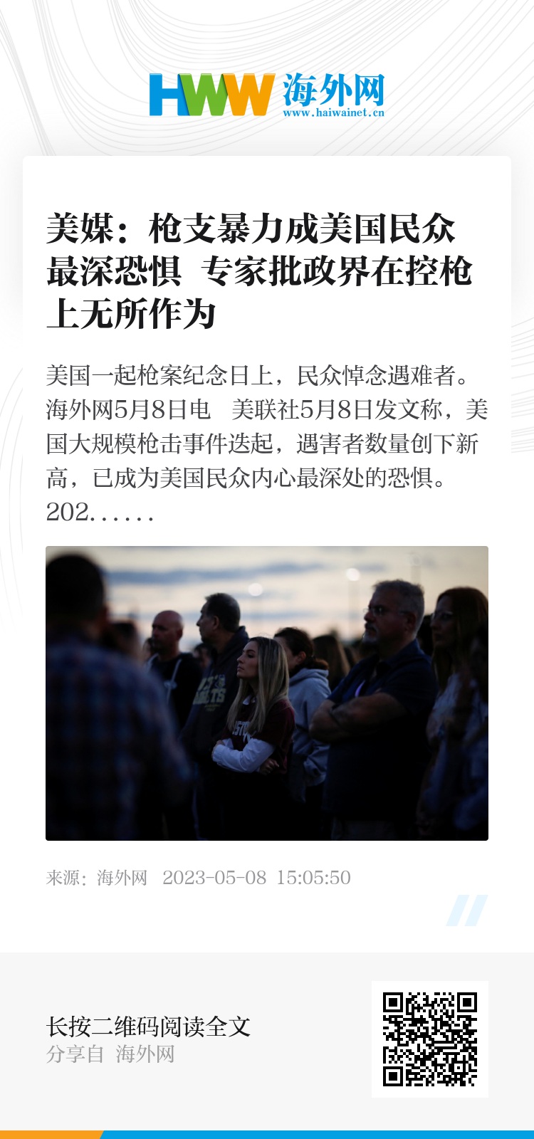 文章表示,大规模枪击事件及其所造成的死亡,不仅令许多家庭四分五裂,而且演变为全美各地民众的集体创伤,引发了他们心中最深处的恐惧。即使专家“给出这些解释,也无法为人们带来哪怕些许慰藉,”文章写道。