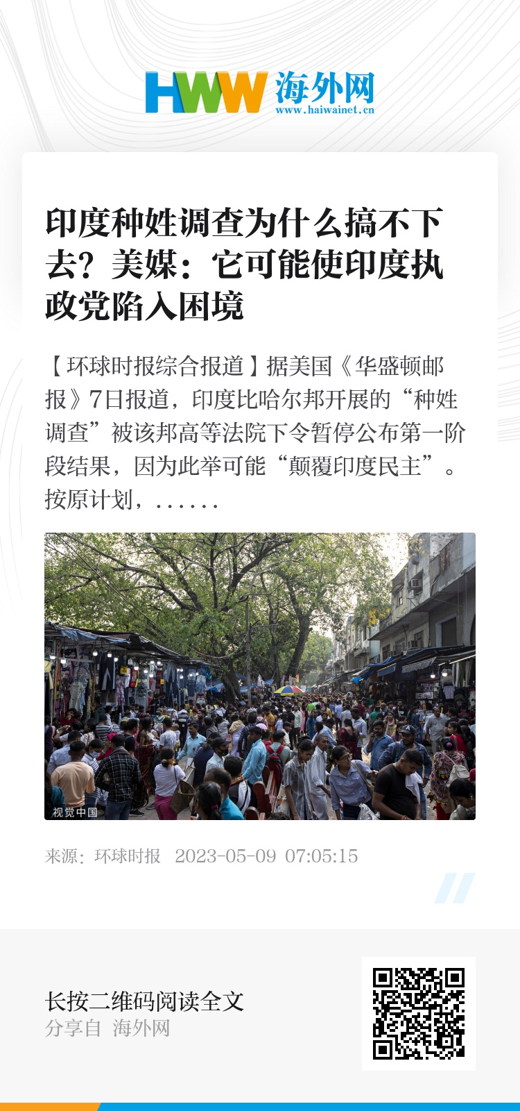 【环球时报综合报道】据美国《华盛顿邮报》7日报道,印度比哈尔邦开展的“种姓调查”被该邦高等法院下令暂停公布第一阶段结果,因为此举可能“颠覆印度民主”。按原计划,种姓调查应于5月15日完成,目前该调查处于暂停状态。《华盛顿邮报》称,起源于印度教的种姓调查已占据印度政治的中心舞台,因为这种严格的社会分层制度“可以改变国家的民主政治,它可能使得执政的印度人民党陷入困境:种姓认同度的增加可能削弱其在选举中的领先地位”。