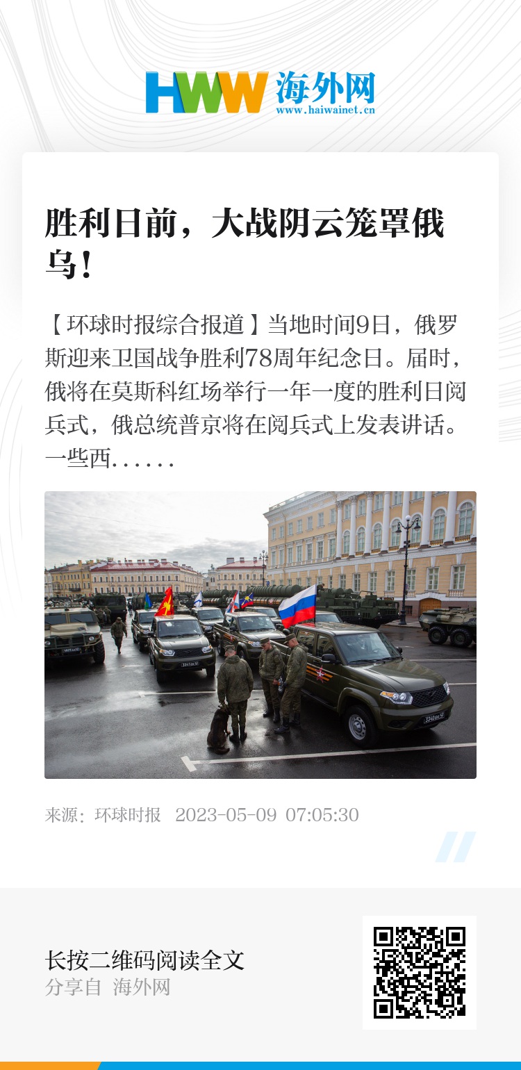 【环球时报综合报道】当地时间9日,俄罗斯迎来卫国战争胜利78周年纪念日。届时,俄将在莫斯科红场举行一年一度的胜利日阅兵式,俄总统普京将在阅兵式上发表讲话。一些西方媒体和舆论猜测,5月9日对俄罗斯而言重要且特别,该国很有可能在当天向乌克兰发起更多进攻。乌陆军总司令瑟尔斯基日前称,俄军想在这一天来临之前占领巴赫穆特。乌军的任务是在此之前守住这座城市。乌克兰官员8日称,随着胜利日的临近,俄罗斯正在加强进攻,对基辅等城市发动新一波无人机、导弹攻击和空袭。当日,乌克兰全境拉响防空警报。与此同时,俄方也多次指责乌方对其实施无人机和火炮攻击。值得注意的是,乌克兰总统泽连斯基8日签署法令,规定乌克兰将在每年5月9日庆祝“欧洲日”,以纪念欧洲大陆的和平与团结。他当天在纪念第二次世界大战结束的讲话中誓言,要像击败纳粹德国一样击败俄罗斯。一些俄媒及分析人士认为,目前,俄乌局势持续胶着,双方在多地展开激烈交火和争夺,战事或已来到重要节点。