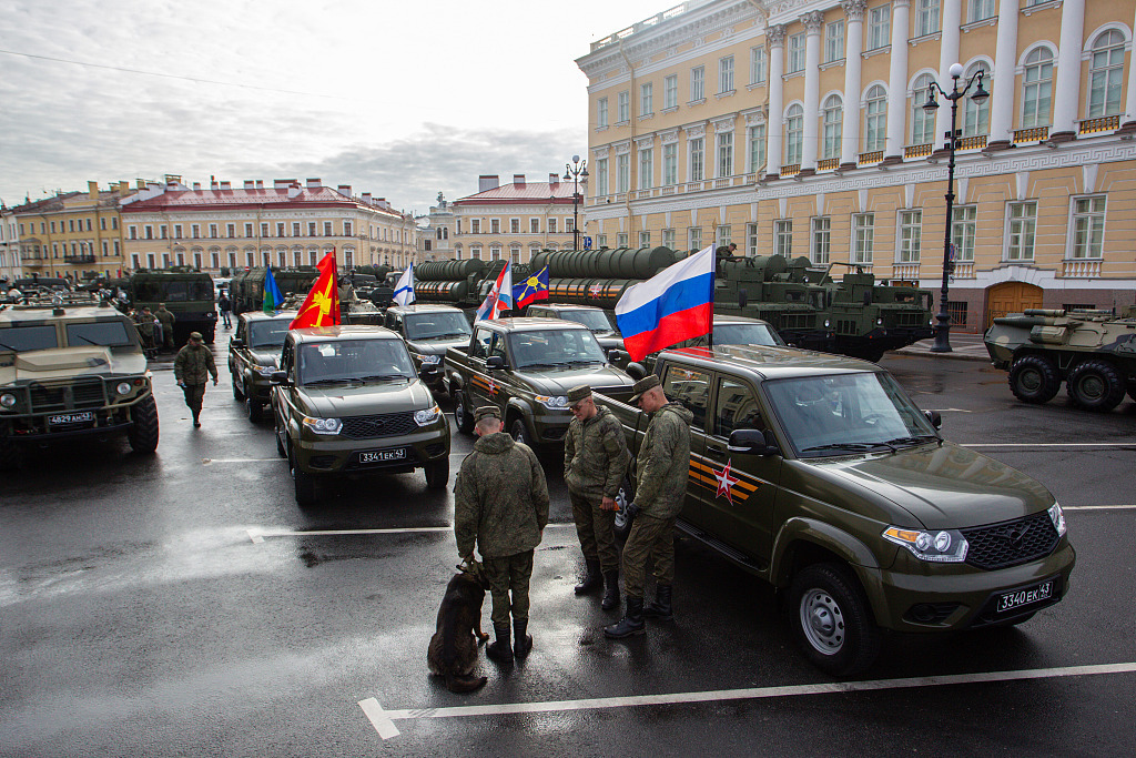 俄罗斯9日迎来卫国战争胜利78周年纪念日。图为当地时间7日,大量停在圣彼得堡一广场上的军事装备及安保人员在等待阅兵式彩排的开始。(视觉中国)