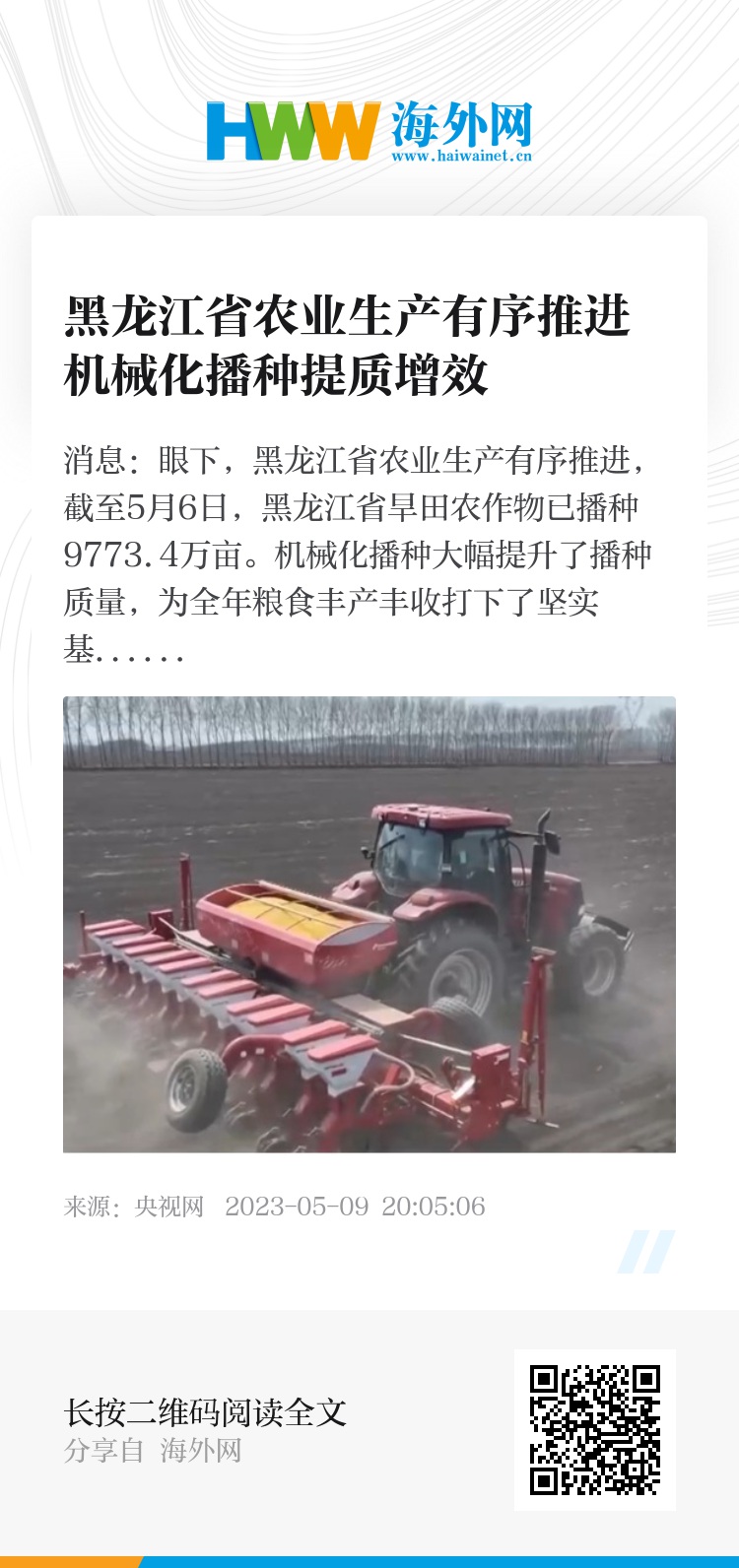 据了解,黑龙江省农业农村厅将继续组成工作指导组,深入县、乡、村,强化农业生产工作指导服务,力争在5月20日前完成旱田农作物大面积播种。