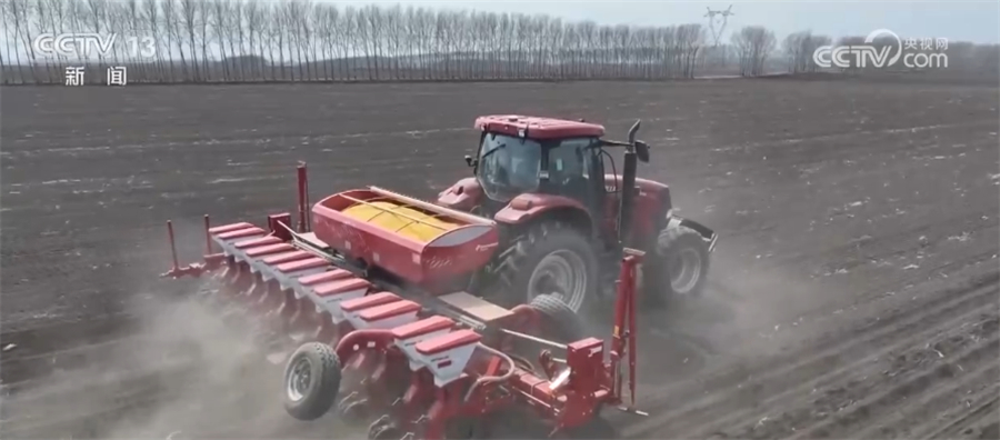 在绥化市兰西县临江镇的玉米播种地块,一台现代化播种机正在进行满负荷作业,通过导航播种、智能监测等数字化设备,可以使播下的每一粒种子都是同样的距离、同样的入土深度。