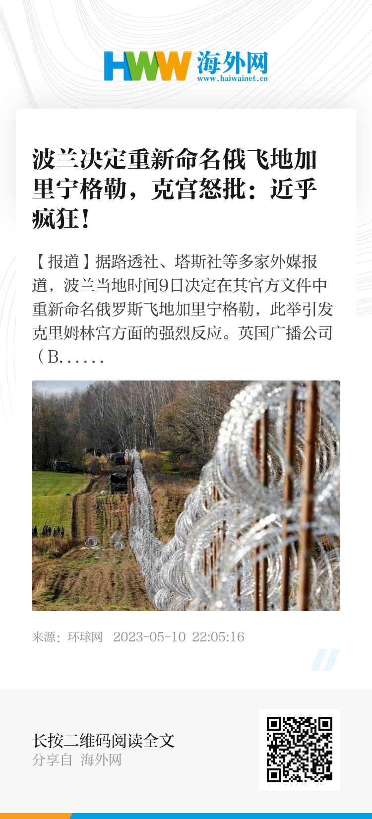 【环球网报道】据路透社、塔斯社等多家外媒报道,波兰当地时间9日决定在其官方文件中重新命名俄罗斯飞地加里宁格勒,此举引发克里姆林宫方面的强烈反应。英国广播公司(BBC)称,克宫发言人佩斯科夫10日怒批此举是“敌对行为”,并且“近乎疯狂”。
