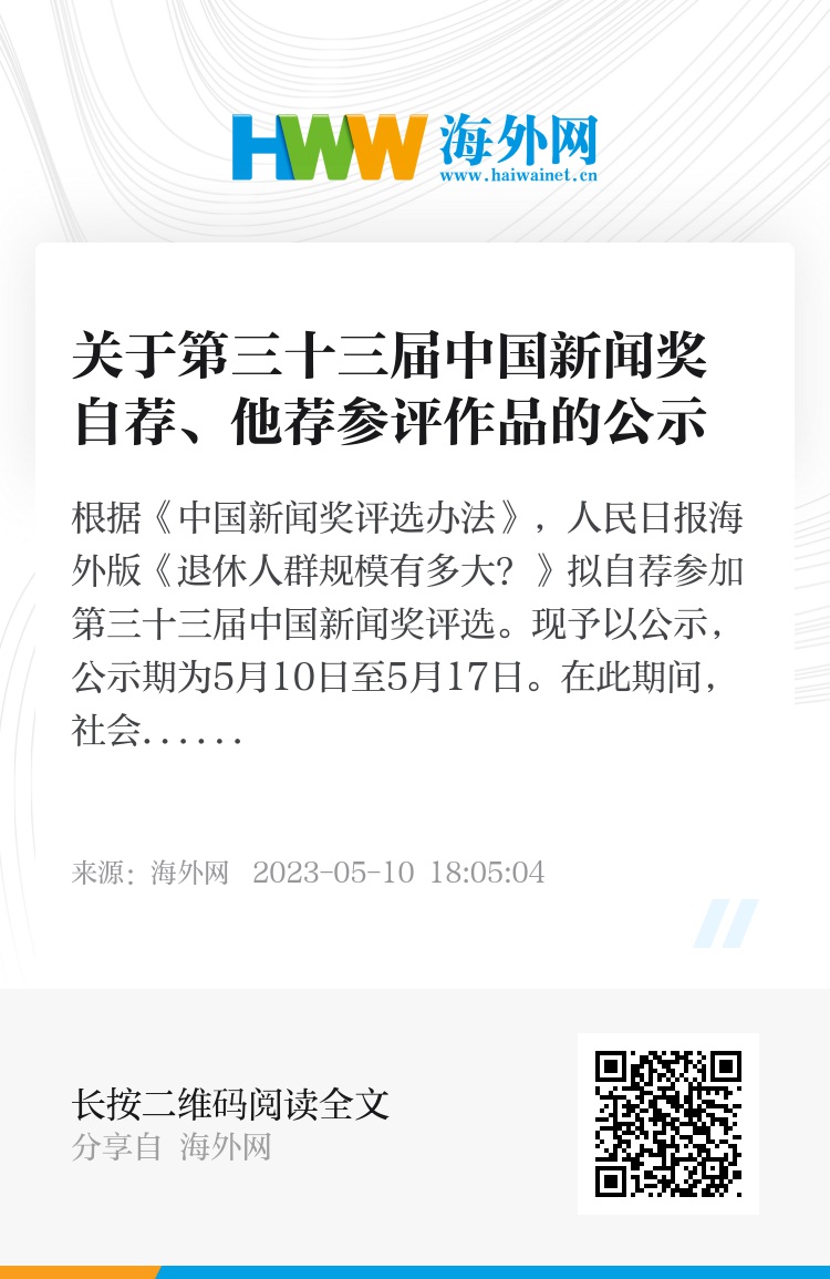 根据《中国新闻奖评选办法》,人民日报海外版《退休人群规模有多大?》拟自荐参加第三十三届中国新闻奖评选。现予以公示,公示期为5月10日至5月17日。在此期间,社会各界可通过电话或电子邮件等方式发表评议意见,逾期不再受理。