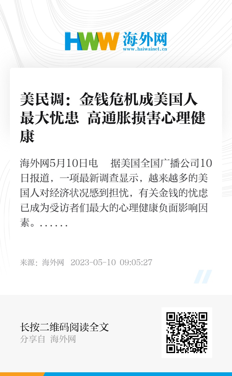 海外网5月10日电 据美国全国广播公司10日报道,一项最新调查显示,越来越多的美国人对经济状况感到担忧,有关金钱的忧虑已成为受访者们最大的心理健康负面影响因素。