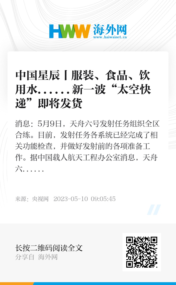 据介绍,天舟六号此次运送的物资主要包括服装、食品、饮用水等。其中,新鲜水果的重量约70公斤,是天舟五号携带水果重量的约两倍,这些水果将同时保障正在空间站的神舟十五号乘组,以及将要进入空间站的神舟十六号乘组的食用需要。