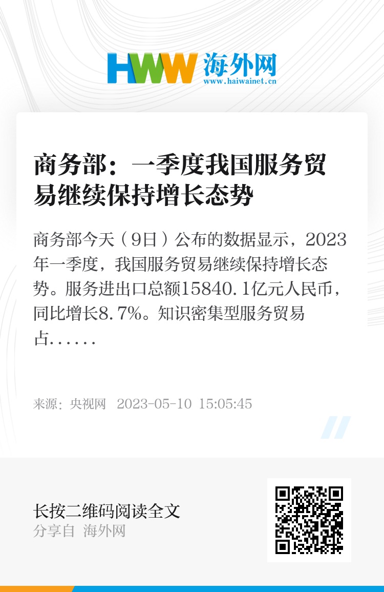 商务部今天(9日)公布的数据显示,2023年一季度,我国服务贸易继续保持增长态势。服务进出口总额15840.1亿元人民币,同比增长8.7%。
