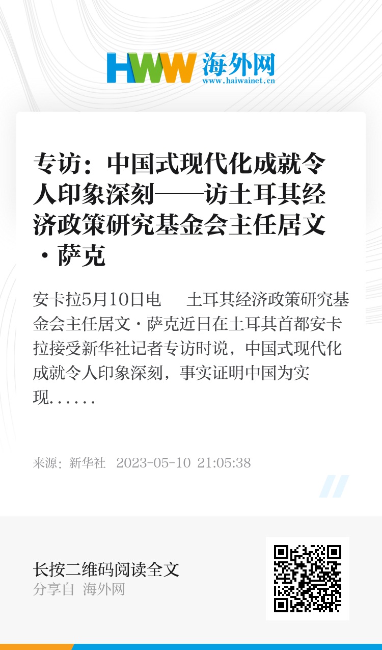 新华社安卡拉5月10日电 土耳其经济政策研究基金会主任居文·萨克近日在土耳其首都安卡拉接受新华社记者专访时说,中国式现代化成就令人印象深刻,事实证明中国为实现现代化而实施的长期发展规划十分成功,世界各国都应走适合自身的发展道路。