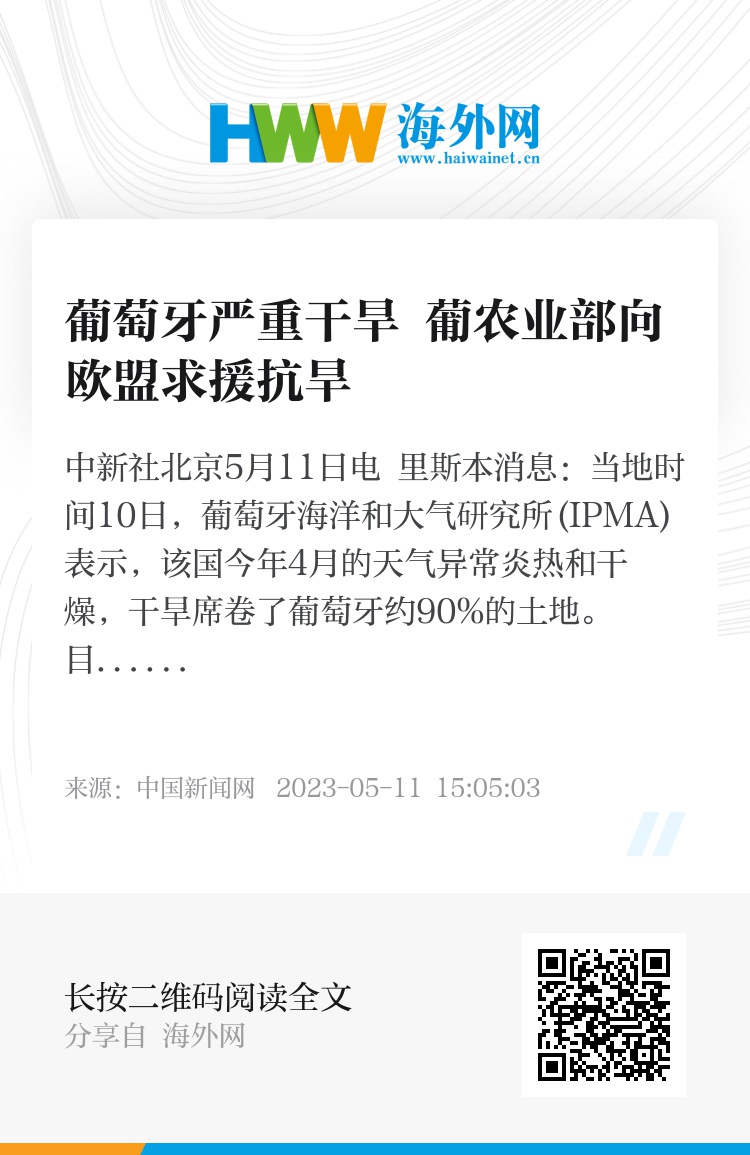据路透社报道,葡萄牙农民联合会称,粮食种植业和畜牧业是受干旱影响最严重的农业部门。葡农业部长安图内斯8日表示,干旱天气正在影响该国农业和水库蓄水量,农业部已要求欧盟委员会解决这一问题,并期待得到欧盟的坚定支持。