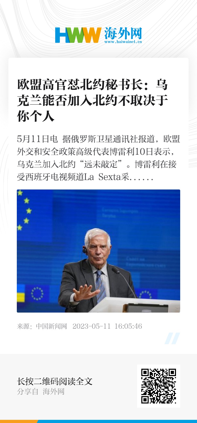 中新网5月11日电 据俄罗斯卫星通讯社报道,欧盟外交和安全政策高级代表博雷利10日表示,乌克兰加入北约“远未敲定”。