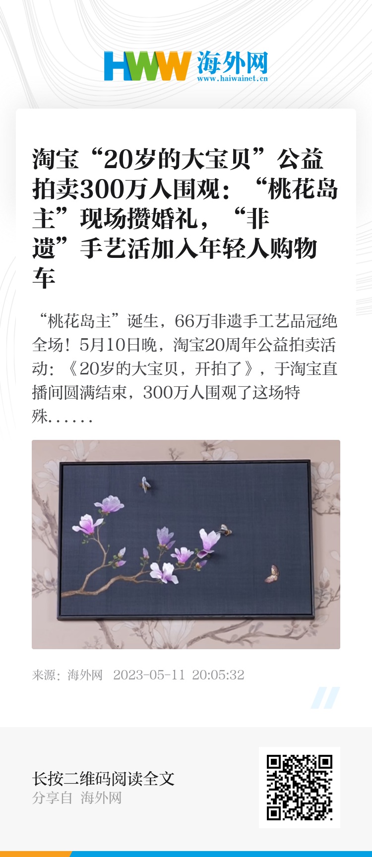 除《苗族古歌》外,柴窑玲珑蝶恋花壶承,以及传统工艺与现代科技相结合的动态苏绣《玉兰蝴蝶》等,具有“非遗”属性的拍品均于5月10日晚在淘宝直播间被拍走。其中,《玉兰蝴蝶》可随触碰改变画面效果,随光感改变颜色,为全球首幅可互动苏绣。
