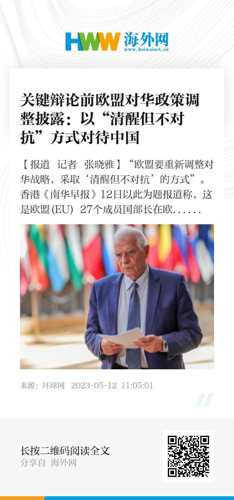 《南华早报》称,于12日的欧盟外长会议之后,欧盟27国领导人预计将于6月在布鲁塞尔举行的峰会上讨论对华战略。但参与者同时提醒说,不要指望很快就能制定出最终战略。“中国是一个非常重要的角色,不可能一劳永逸得出最终战略。”一位西欧高级外交官称,“我不能说我们很快就能准备好(对华战略)。它将是一个不断开放的进程。”