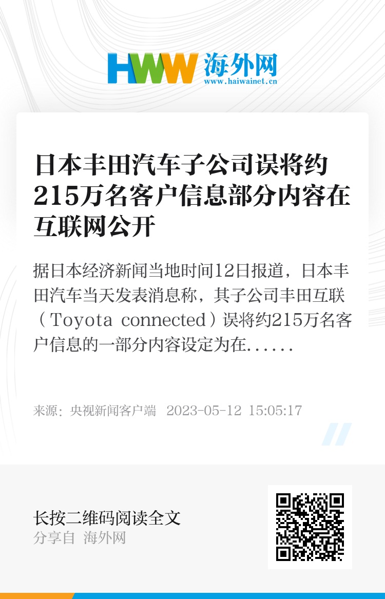 据日本经济新闻当地时间12日报道,日本丰田汽车当天发表消息称,其子公司丰田互联(Toyota connected)误将约215万名客户信息的一部分内容设定为在互联网上可公开浏览状态,内容包括车辆编号及位置信息等。丰田公司称这些资料是用于内部管理的信息,并不会追踪到顾客个人,并表示目前还未确认到数据被不法使用。(总台记者 何欣蕾)