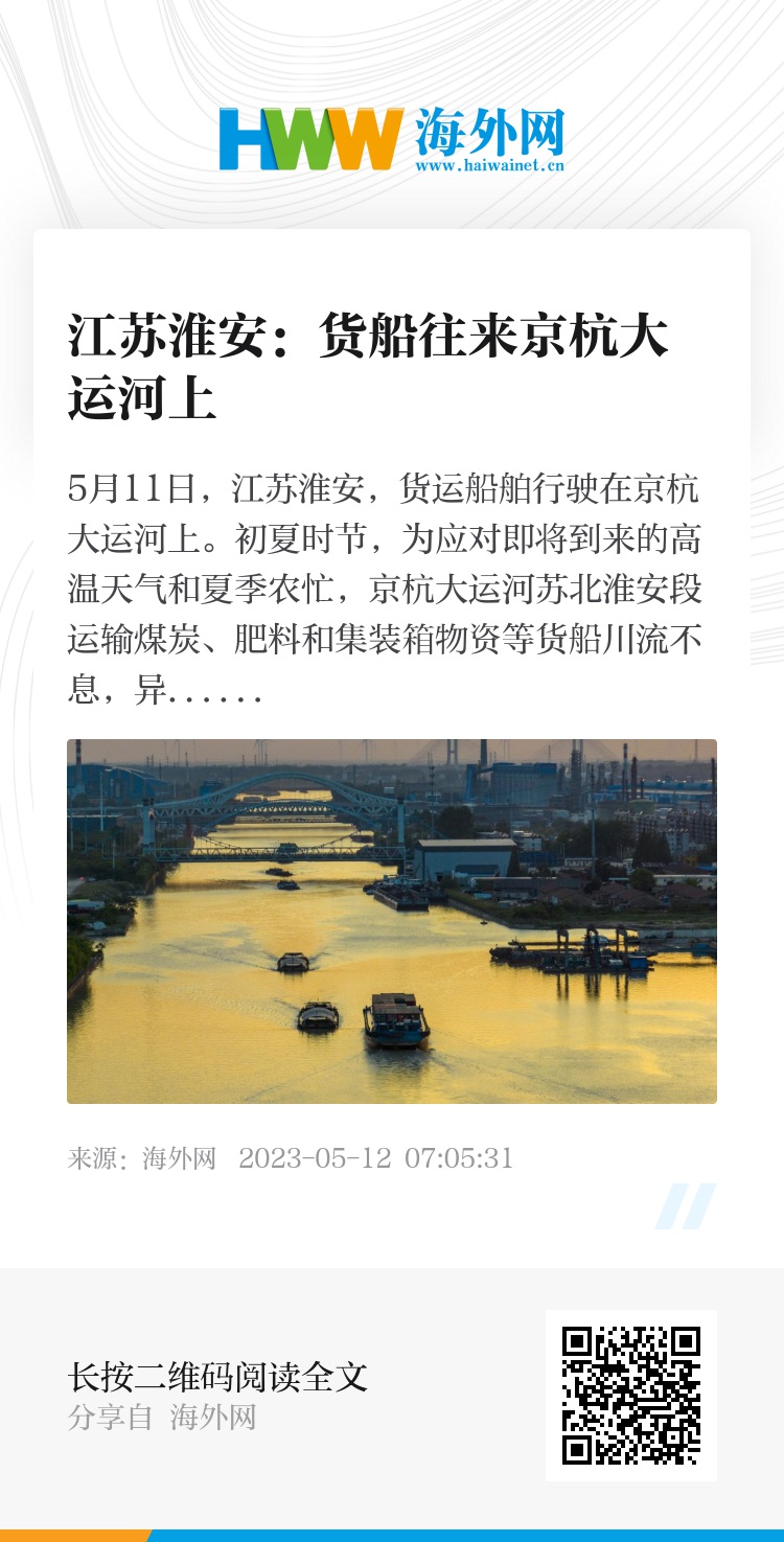 5月11日,江苏淮安,货运船舶行驶在京杭大运河上。初夏时节,为应对即将到来的高温天气和夏季农忙,京杭大运河苏北淮安段运输煤炭、肥料和集装箱物资等货船川流不息,异常忙碌。来源:视觉中国