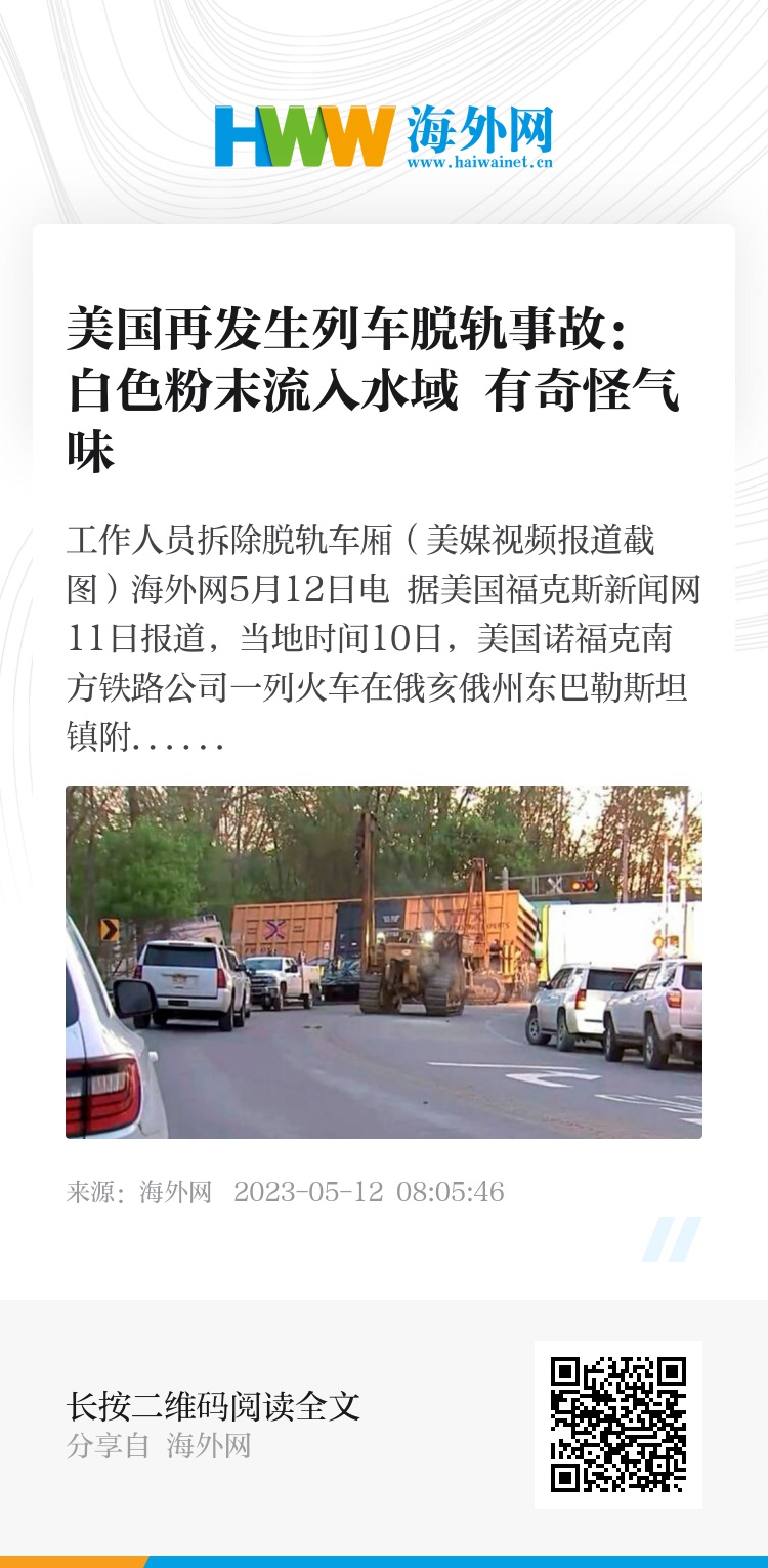 此次事件发生的三个月前,诺福克南方铁路公司一列载有化学危险品的列车在东巴勒斯坦镇区域脱轨,造成严重威胁,全镇民众被疏散。事故对该镇的空气、水资源和土壤的影响一直挥之不去,美国司法部3月对诺福克南方铁路公司提起诉讼。(海外网 李萌)