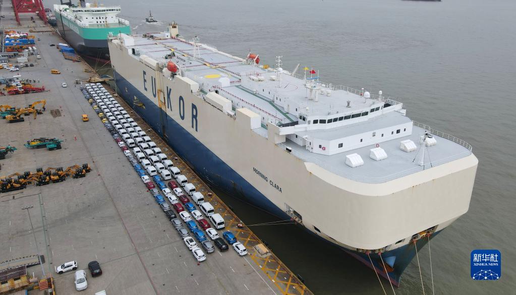 在位于上海外高桥的海通国际汽车码头,一批上汽集团乘用车停在码头上等待装运,发往澳大利亚(无人机照片,2022年5月25日摄)。新华社记者 方喆 摄
