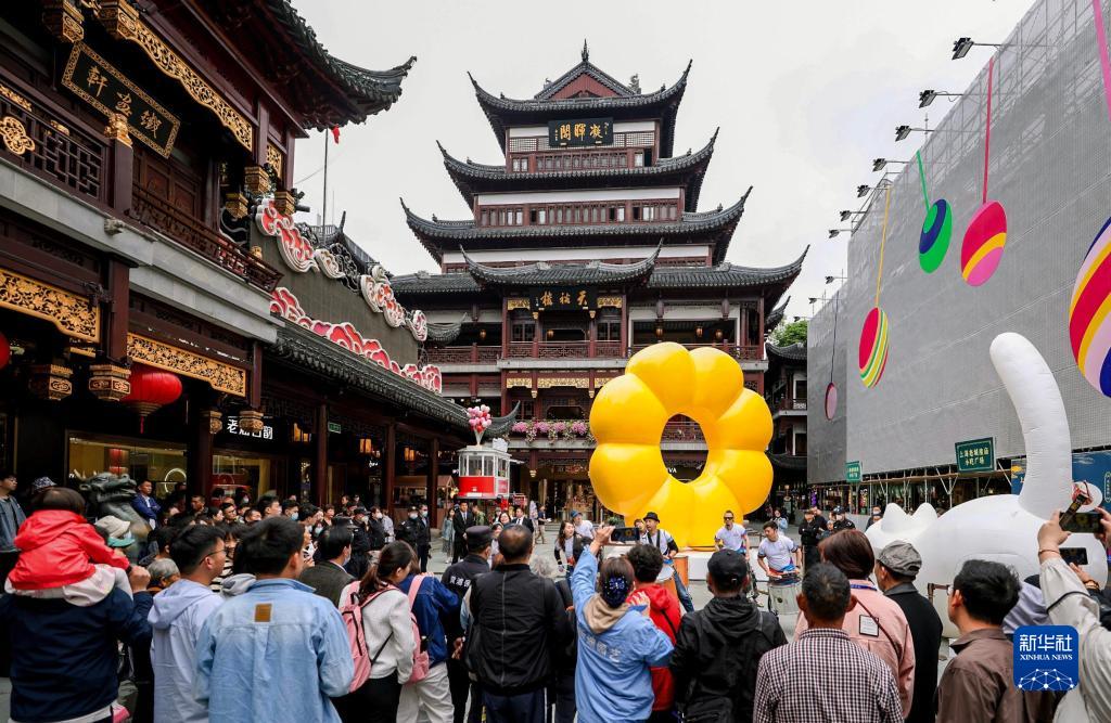 5月7日,市民游客在上海豫园商城中心广场观看街头艺术表演。新华社记者 刘颖 摄