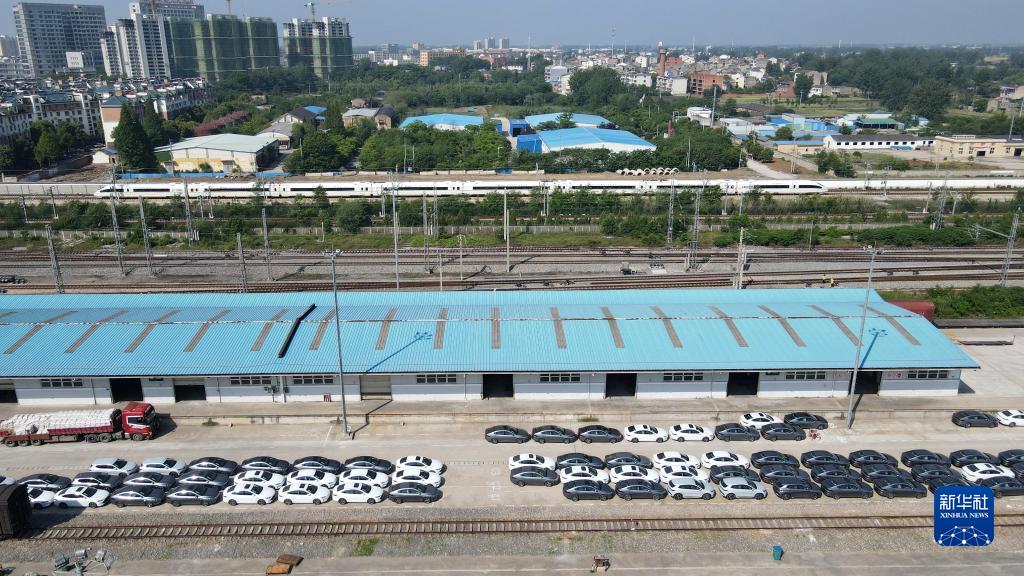 这是位于合肥市长丰县的铁路水家湖货运站等待装车外运的新能源汽车(5月9日,无人机照片)。新华社记者 刘军喜 摄