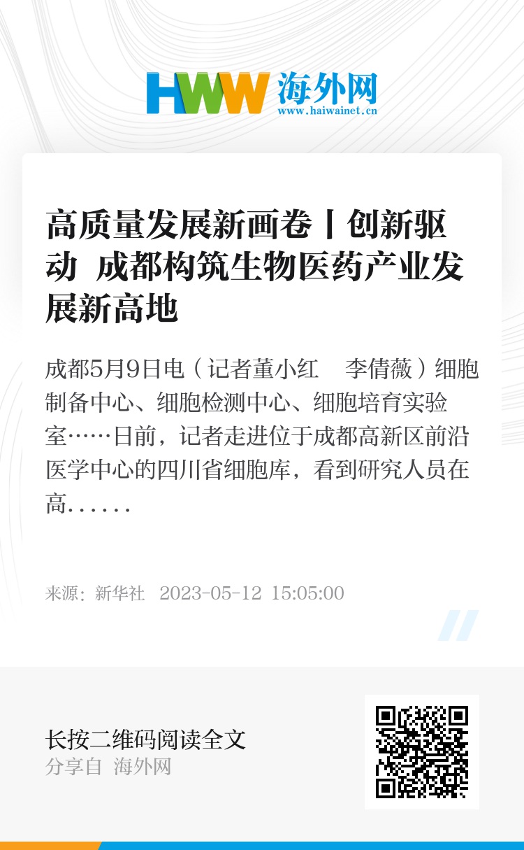 新华社成都5月9日电(记者董小红 李倩薇)细胞制备中心、细胞检测中心、细胞培育实验室……日前,记者走进位于成都高新区前沿医学中心的四川省细胞库,看到研究人员在高端仪器设备前忙碌着。