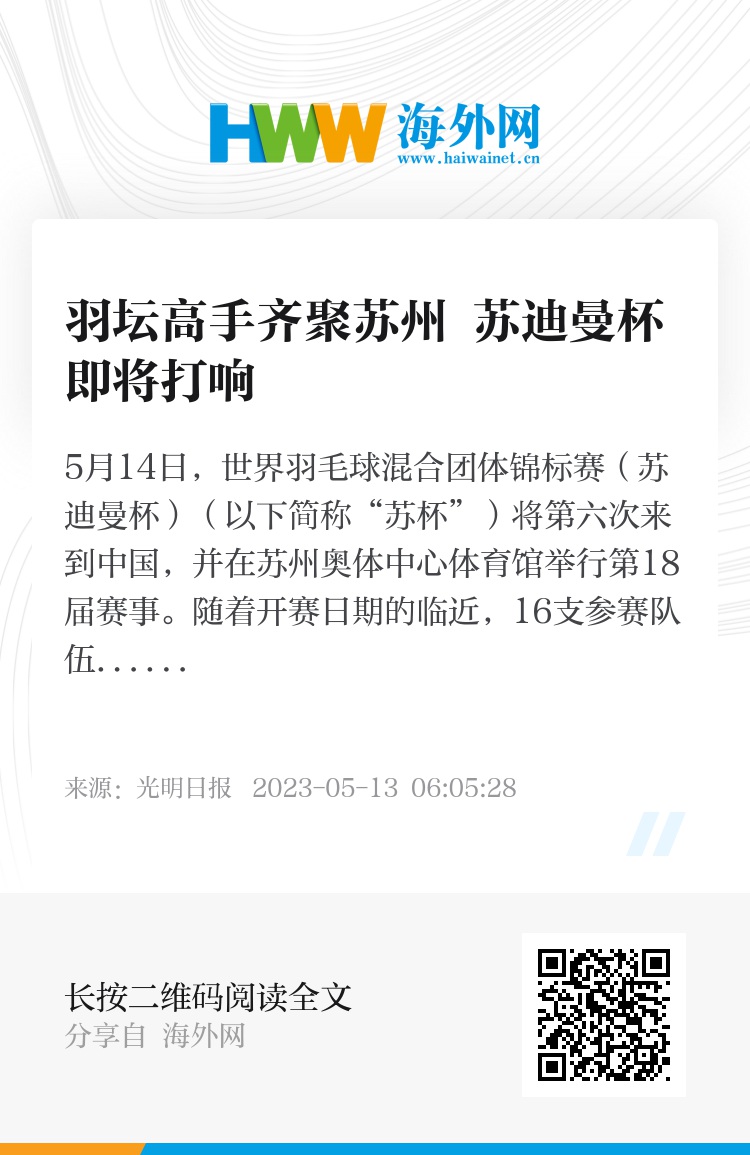 5月14日,世界羽毛球混合团体锦标赛(苏迪曼杯)(以下简称“苏杯”)将第六次来到中国,并在苏州奥体中心体育馆举行第18届赛事。