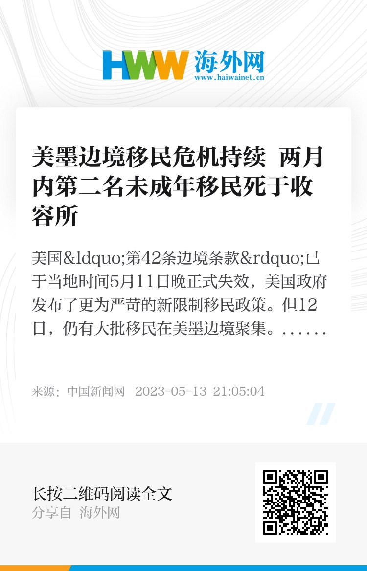 数据显示,截至10日,共有8681名无人陪伴的未成年移民,被美国卫生与公众服务部下属的难民安置办公室安置在收容所和其他机构中,直到他们年满18岁或被亲友等担保人认领方可离开。(央视新闻客户端)