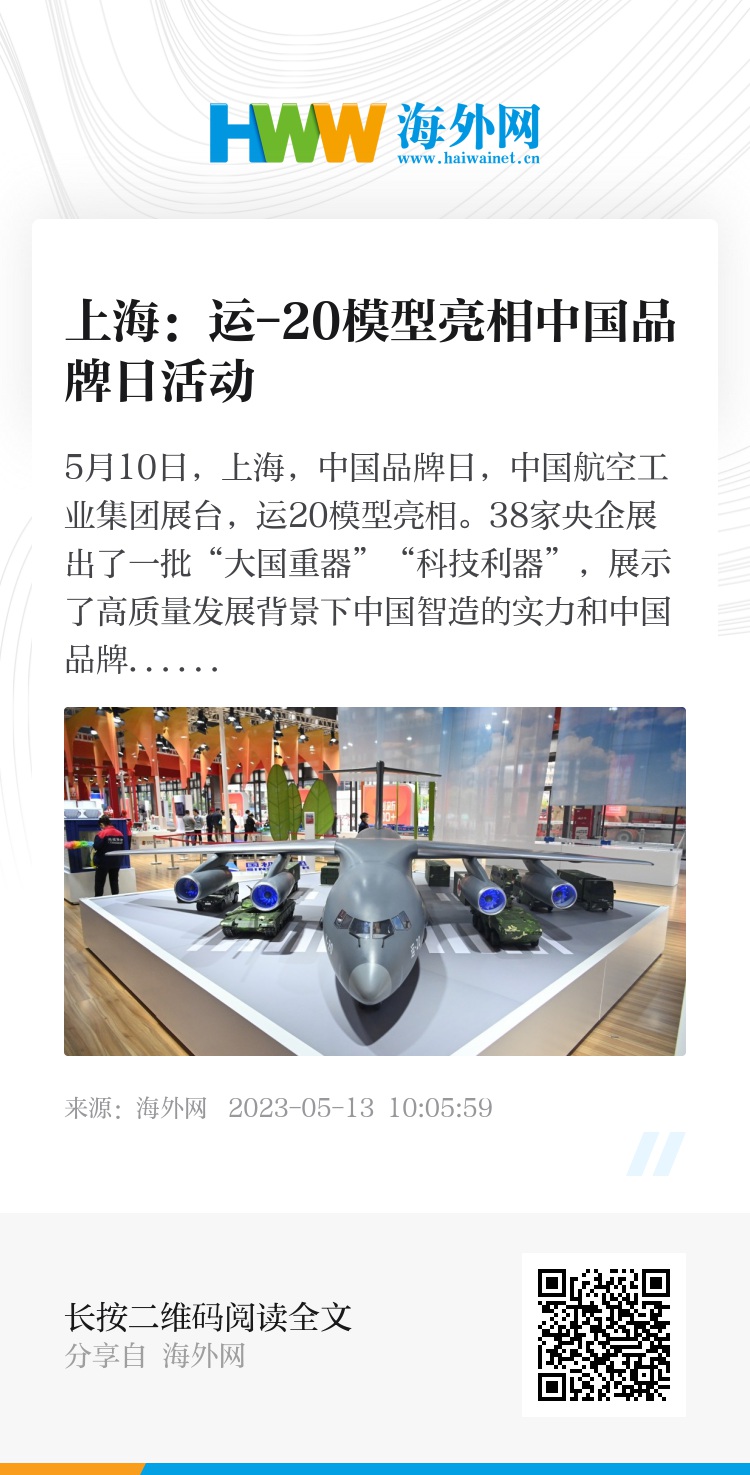 5月10日,上海,中国品牌日,中国航空工业集团展台,运20模型亮相。38家央企展出了一批“大国重器”“科技利器”,展示了高质量发展背景下中国智造的实力和中国品牌的新活力。图片来源:视觉中国