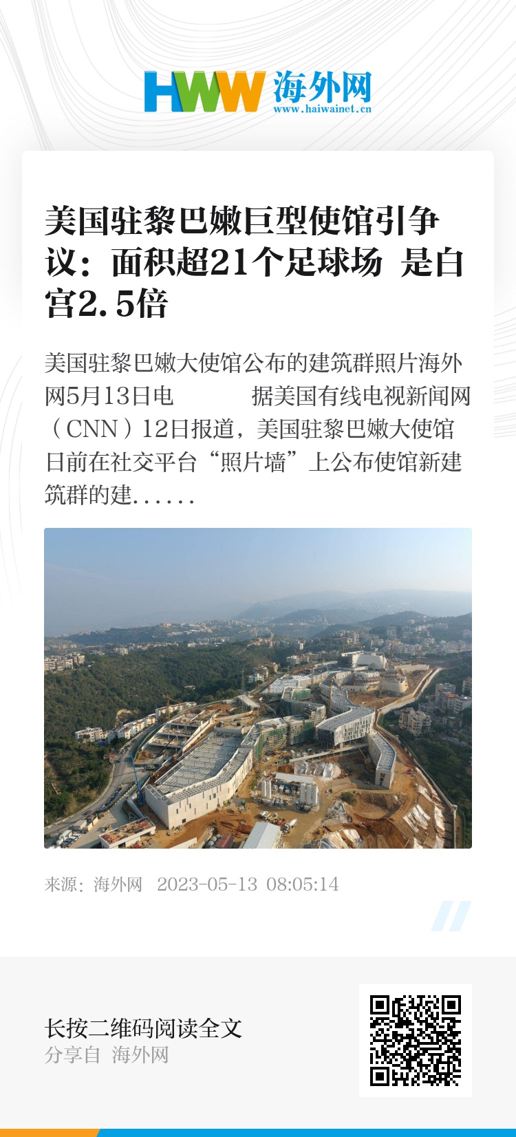 海外网5月13日电 据美国有线电视新闻网(CNN)12日报道,美国驻黎巴嫩大使馆日前在社交平台“照片墙”上公布使馆新建筑群的建设进度,其面积超过21个足球场,规模之庞大引发舆论争议。
