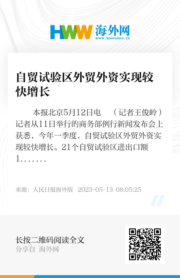 本报北京5月12日电 (记者王俊岭)记者从11日举行的商务部例行新闻发布会上获悉,今年一季度,自贸试验区外贸外资实现较快增长。21个自贸试验区进出口额1.8万亿元,同比增长6.6%,高出全国1.8个百分点;实际使用外资719亿元,同比增长22.1%,高出全国17.2个百分点。自贸试验区进出口总额和实际使用外资占21个省(区、市)的比重分别为19.4%和18.1%。