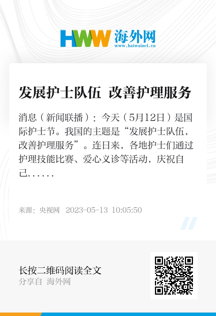 央视网消息(新闻联播):今天(5月12日)是国际护士节。我国的主题是“发展护士队伍,改善护理服务”。