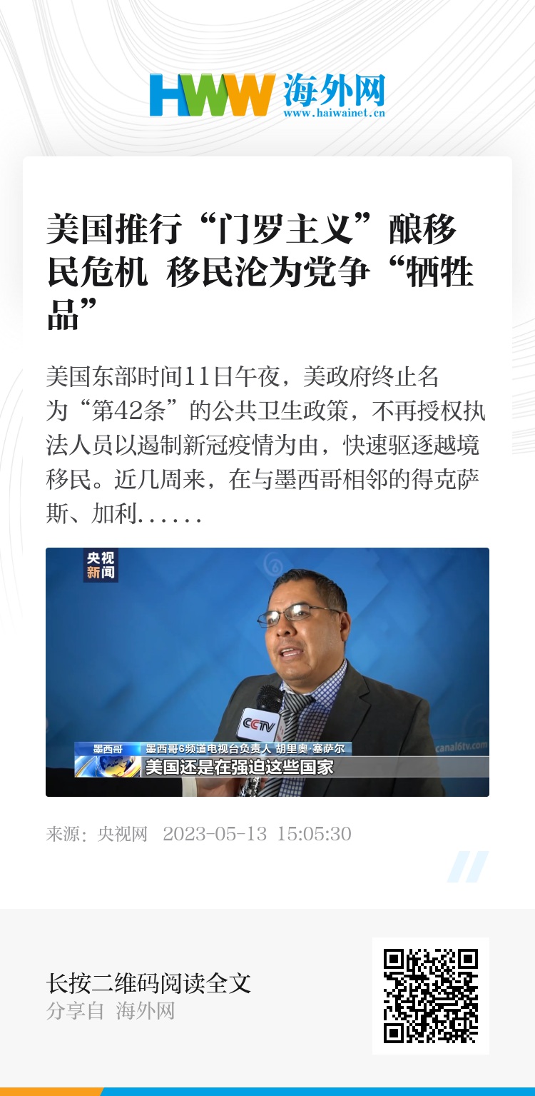 墨西哥6频道电视台负责人 胡里奥·塞萨尔:事实上很多(非法)移民被迫离开家乡前往美国,恰恰是美国封锁和制裁这些国家所导致的结果。我们可以看到,美国还是在强迫这些国家接受“门罗主义”。