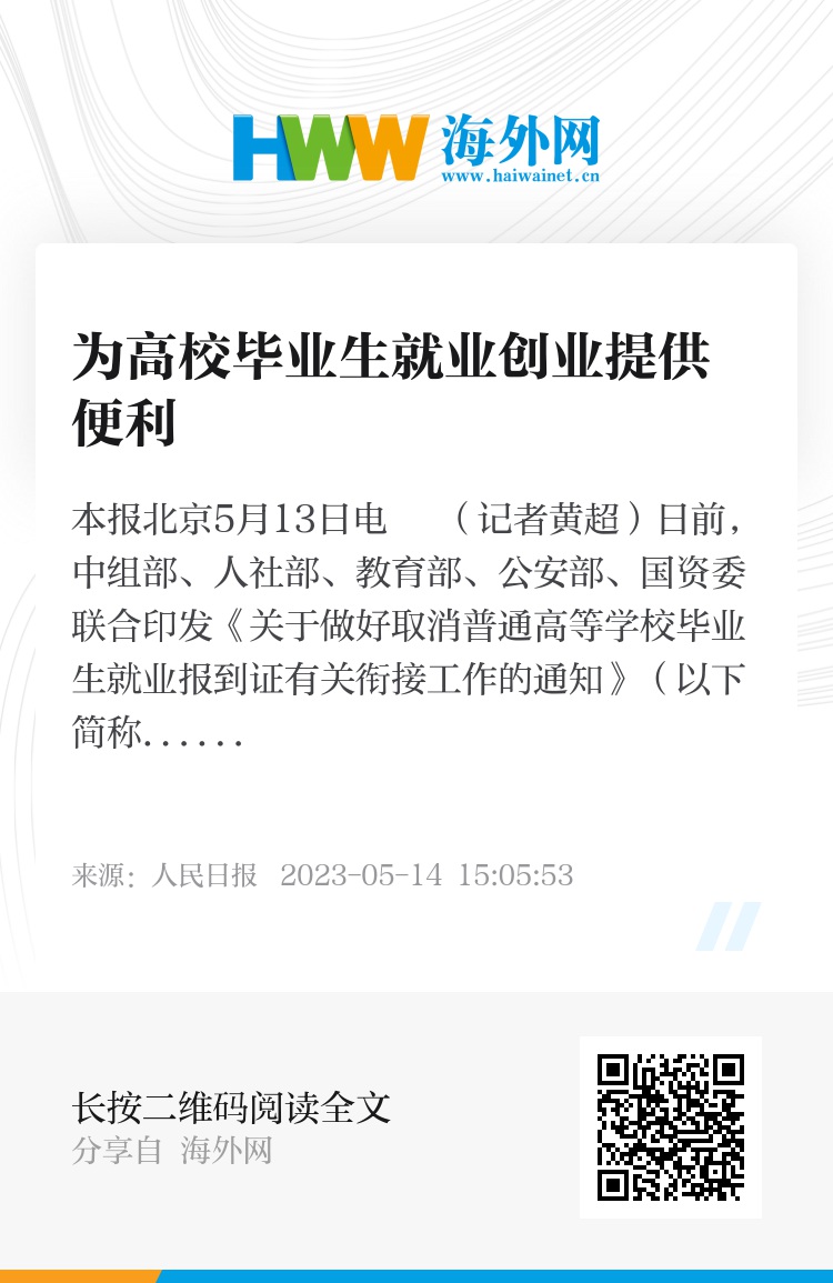 本报北京5月13日电 (记者黄超)日前,中组部、人社部、教育部、公安部、国资委联合印发《关于做好取消普通高等学校毕业生就业报到证有关衔接工作的通知》(以下简称《通知》),明确2023年起,不再发放《全国普通高等学校本专科毕业生就业报到证》和《全国毕业研究生就业报到证》(以下统称就业报到证),取消就业报到证补办、改派手续,不再将就业报到证作为办理高校毕业生招聘录用、落户、档案接收转递等手续的必需材料。