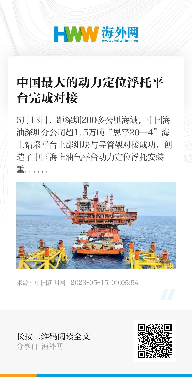 5月13日,距深圳200多公里海域,中国海油深圳分公司超1.5万吨“恩平20—4”海上钻采平台上部组块与导管架对接成功,创造了中国海上油气平台动力定位浮托安装重量的新纪录,同时填补中国动力定位浮托自主设计安装技术空白。(无人机照片)中新社记者 陈文 摄