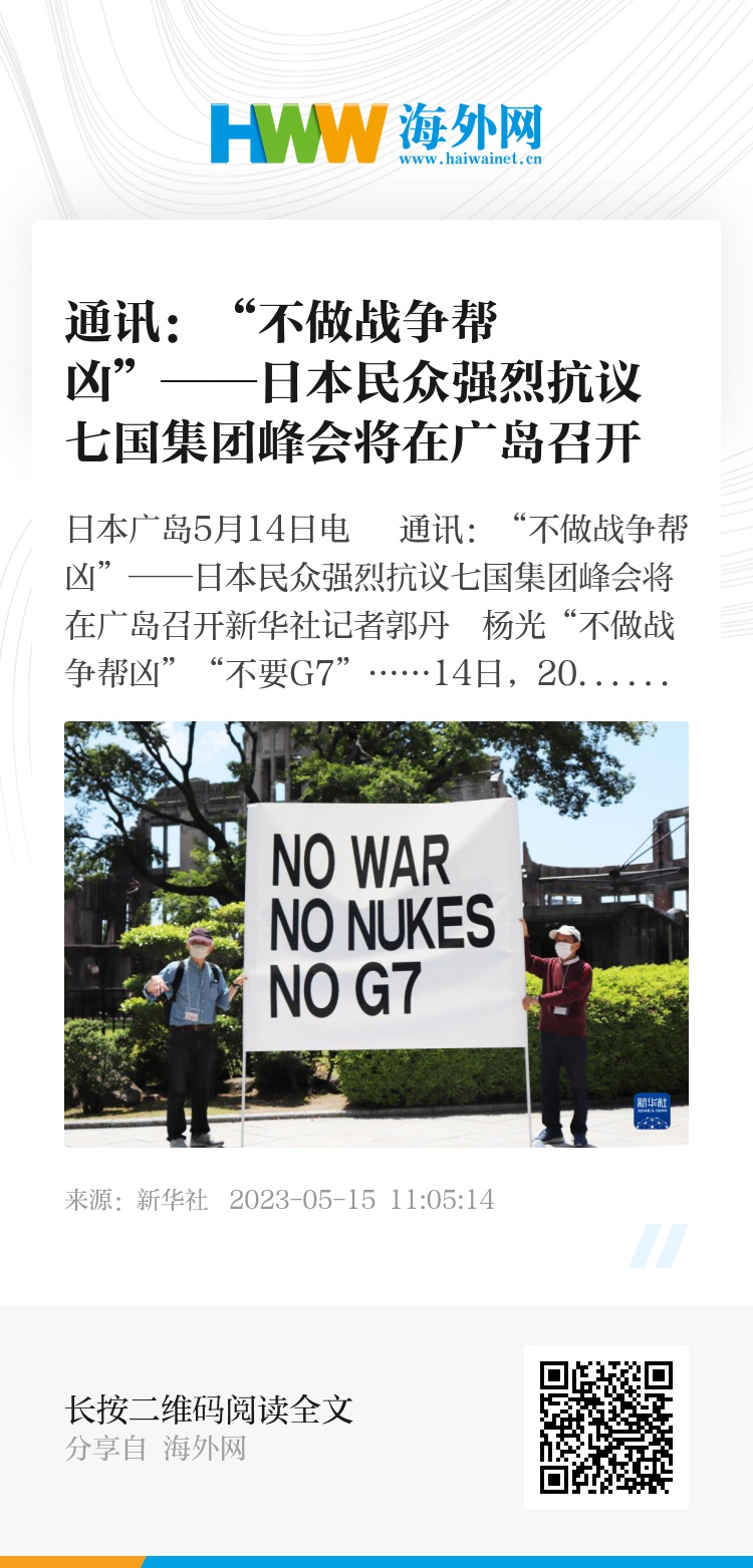 新华社日本广岛5月14日电 通讯:“不做战争帮凶”——日本民众强烈抗议七国集团峰会将在广岛召开