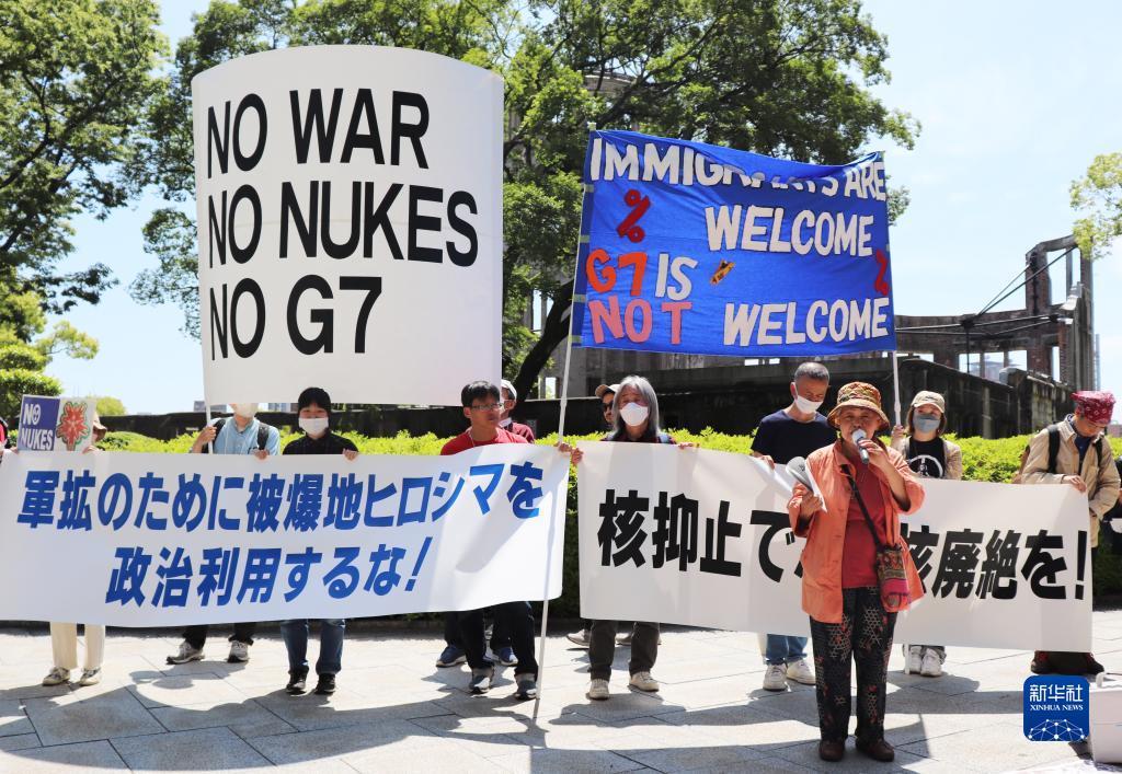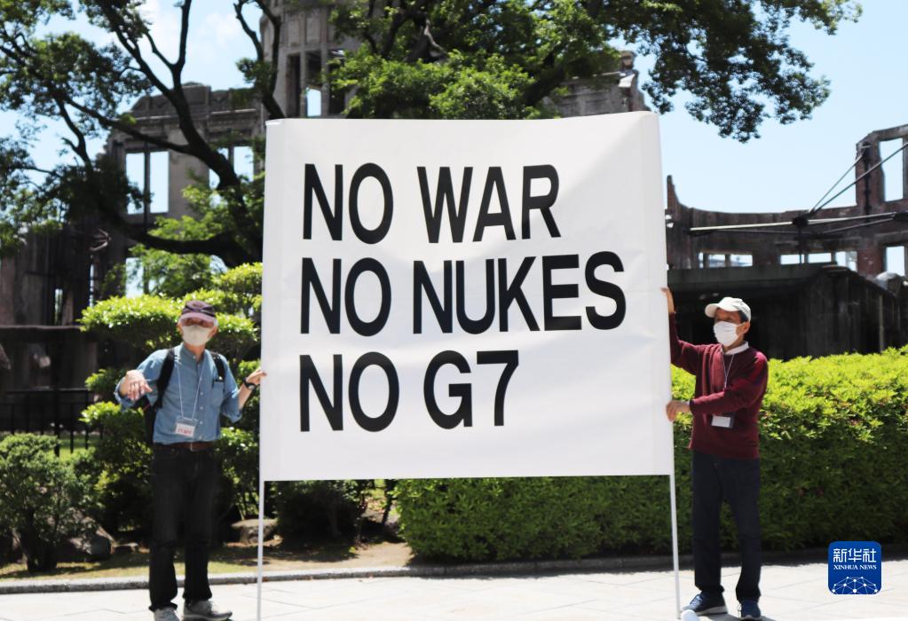 5月14日,在日本广岛和平纪念公园原子弹轰炸遗址前,日本民众举着“不要战争、不要核武器、不要G7”等标语,强烈抗议七国集团(G7)峰会将在广岛召开。新华社记者 杨光 摄