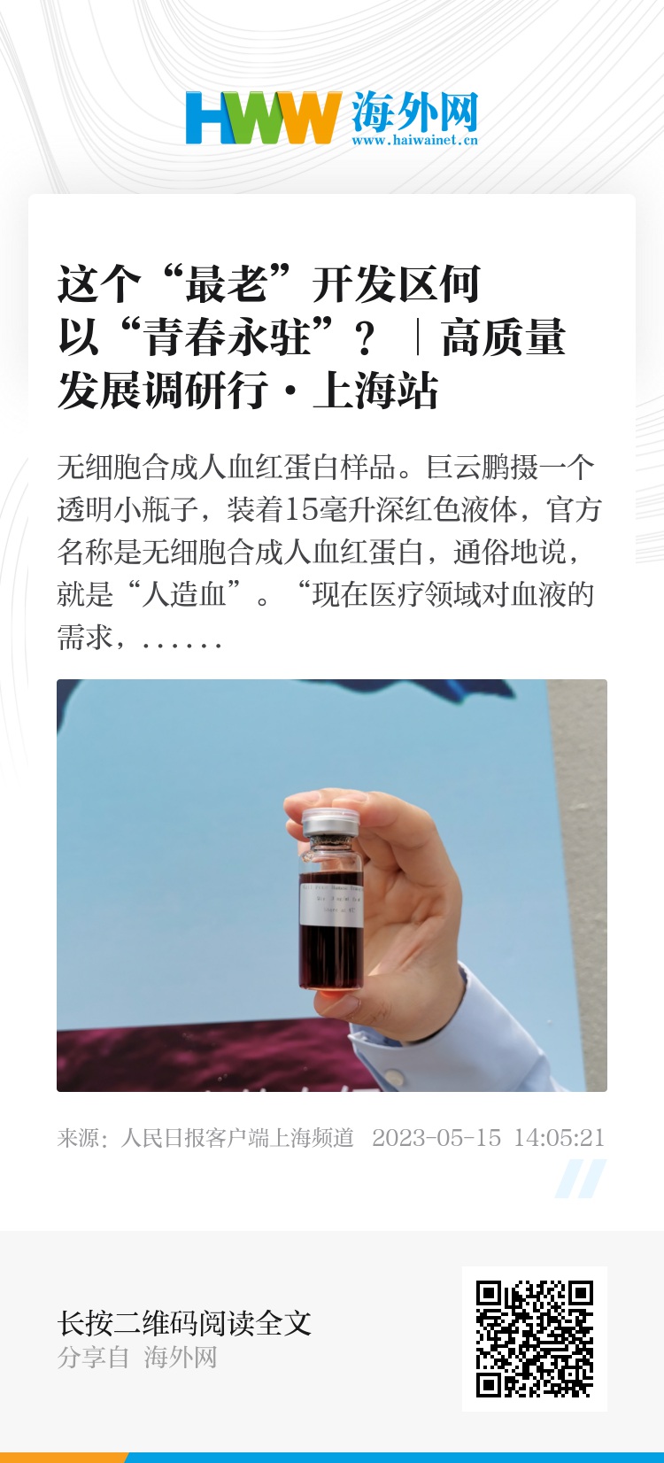 “现在医疗领域对血液的需求,主要是需要其中的血红蛋白细胞来传输氧气,但同时细胞会被氧化、失活。”5月13日,在上海闵行经济技术开发区,康码(上海)生物科技有限公司董事长郭敏说,用无细胞蛋白质合成血红蛋白,不用担心氧气对细胞的破坏,这项技术1958年就已经实现,但几十年来,“人造血”难以量产一直是困扰国内外的难题,是医学临床领域还未被满足的最大需求之一。
