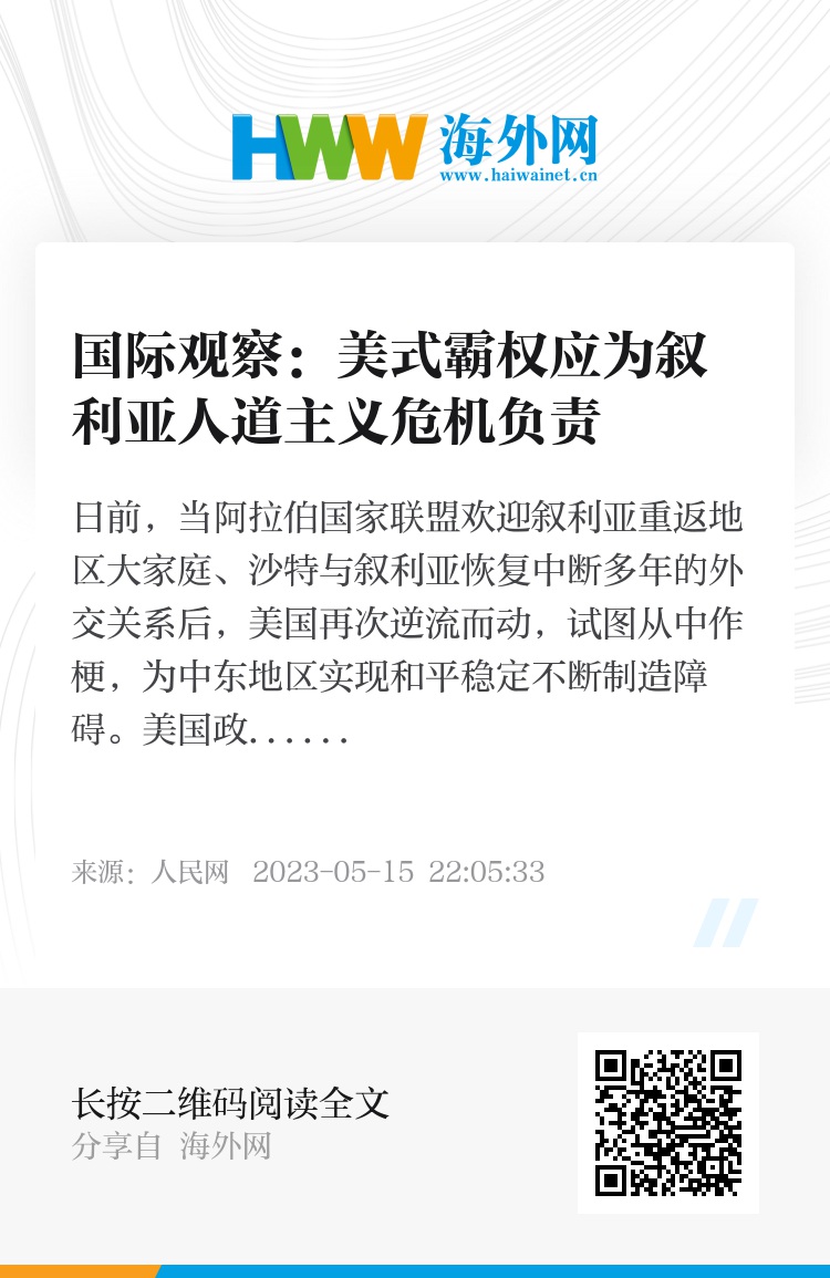 12年来,叙利亚人民饱受战争与动荡之苦,也认清了霸权对人权造成的无尽伤害,美式霸权应为叙利亚人道主义危机负责。在中东地区迎来和解与团结大潮的背景下,美国必须认清形势、尊重民意,放弃傲慢与偏见,放下地缘政治算计和维护霸权的私利,立即解除对叙利亚的所有非法单边制裁,立即结束在叙非法驻军和掠夺行径,停止人为制造人道主义灾难,切实遵守联合国宪章宗旨原则和国际法准则,切实尊重别国主权独立和领土完整,还叙利亚人民以真正的人权、财富、自由和尊严。(西门樵)