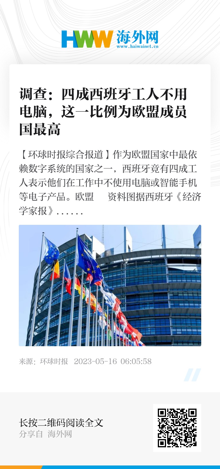 据西班牙《经济学家报》14日报道,欧洲改善生活和工作条件基金会(欧洲基金会)最新发布的《欧洲工作条件调查》显示,27%的受访西班牙人在工作中从未使用电脑,13%的人很少或偶尔使用。调查报告称,这一比例为欧盟成员国最高,只有希腊和意大利与之相近。
