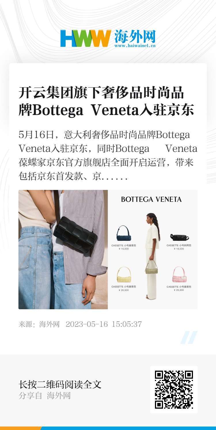 作为继Qeelin之后,开云集团与京东开启官方合作的首个奢侈品时尚品牌,此次入驻,Bottega Veneta不仅与京东优化整体购物链路;还同步在特色货品供给、强化礼遇心智等方面深化合作,为消费者提供更多元的商品选择和优质服务。此番合作也标志着京东与全球顶级奢侈品品牌合作的又一次突破。
