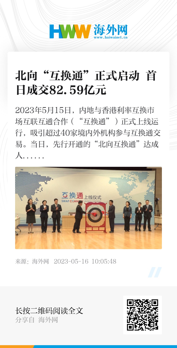 2023年5月15日,内地与香港利率互换市场互联互通合作(“互换通”)正式上线运行,吸引超过40家境内外机构参与互换通交易。当日,先行开通的“北向互换通”达成人民币利率互换交易162笔,名义本金总额82.59亿元人民币。图片来源:视觉中国