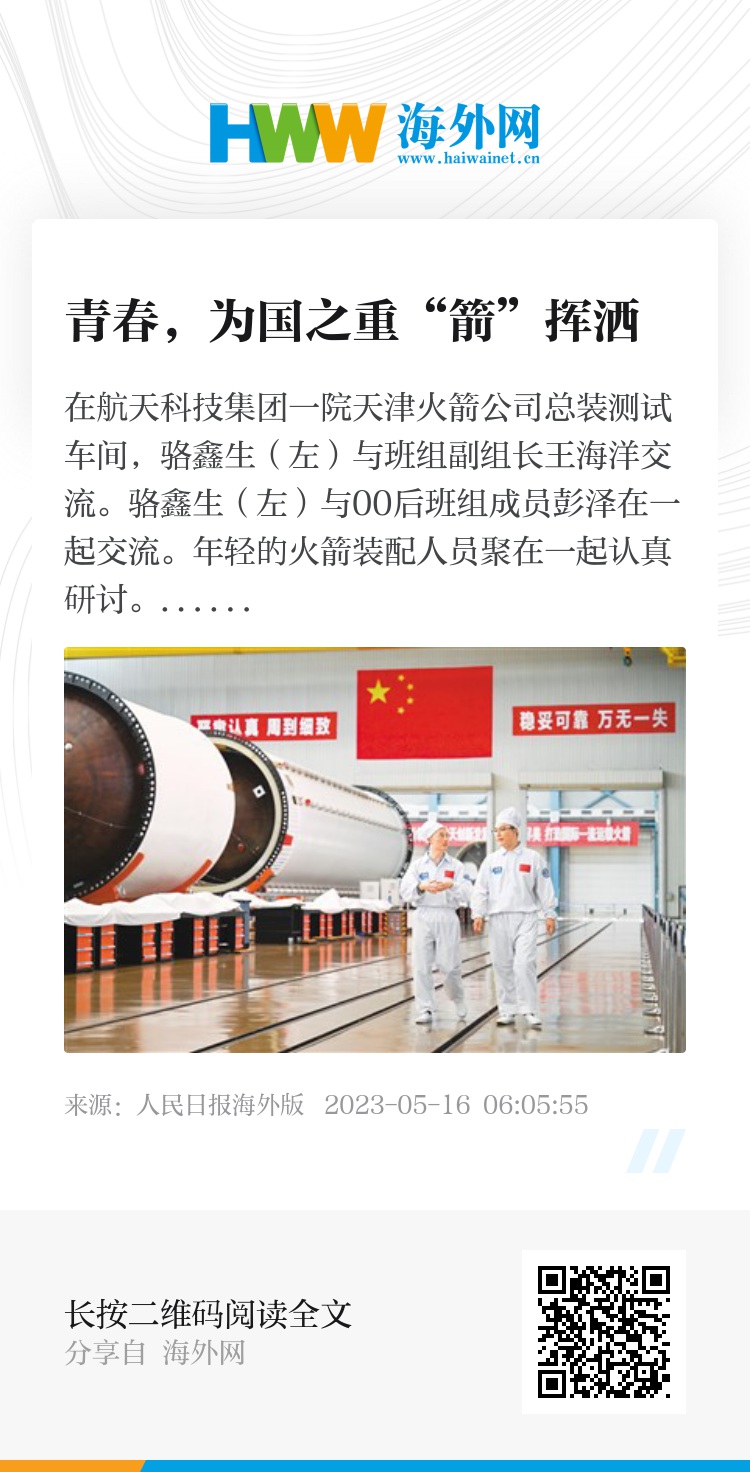 1988年出生的骆鑫生是中国航天科技集团一院天津火箭公司总装测试车间装配一组班组长。他和同事们承担着中国长五、长七系列等新一代运载火箭的总装测试工作。