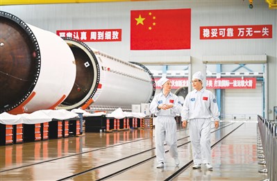 在航天科技集团一院天津火箭公司总装测试车间,骆鑫生(左)与班组副组长王海洋交流。
