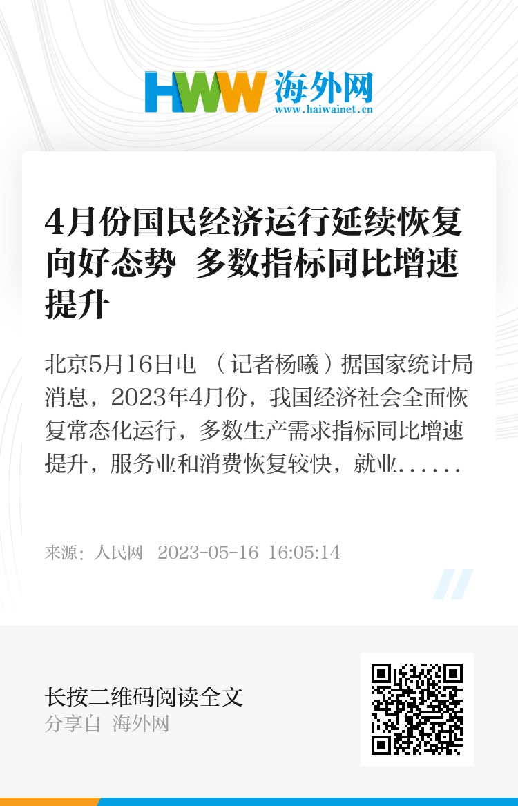 人民网北京5月16日电 (记者杨曦)据国家统计局消息,2023年4月份,我国经济社会全面恢复常态化运行,多数生产需求指标同比增速提升,服务业和消费恢复较快,就业物价总体稳定,经济运行延续恢复向好态势。