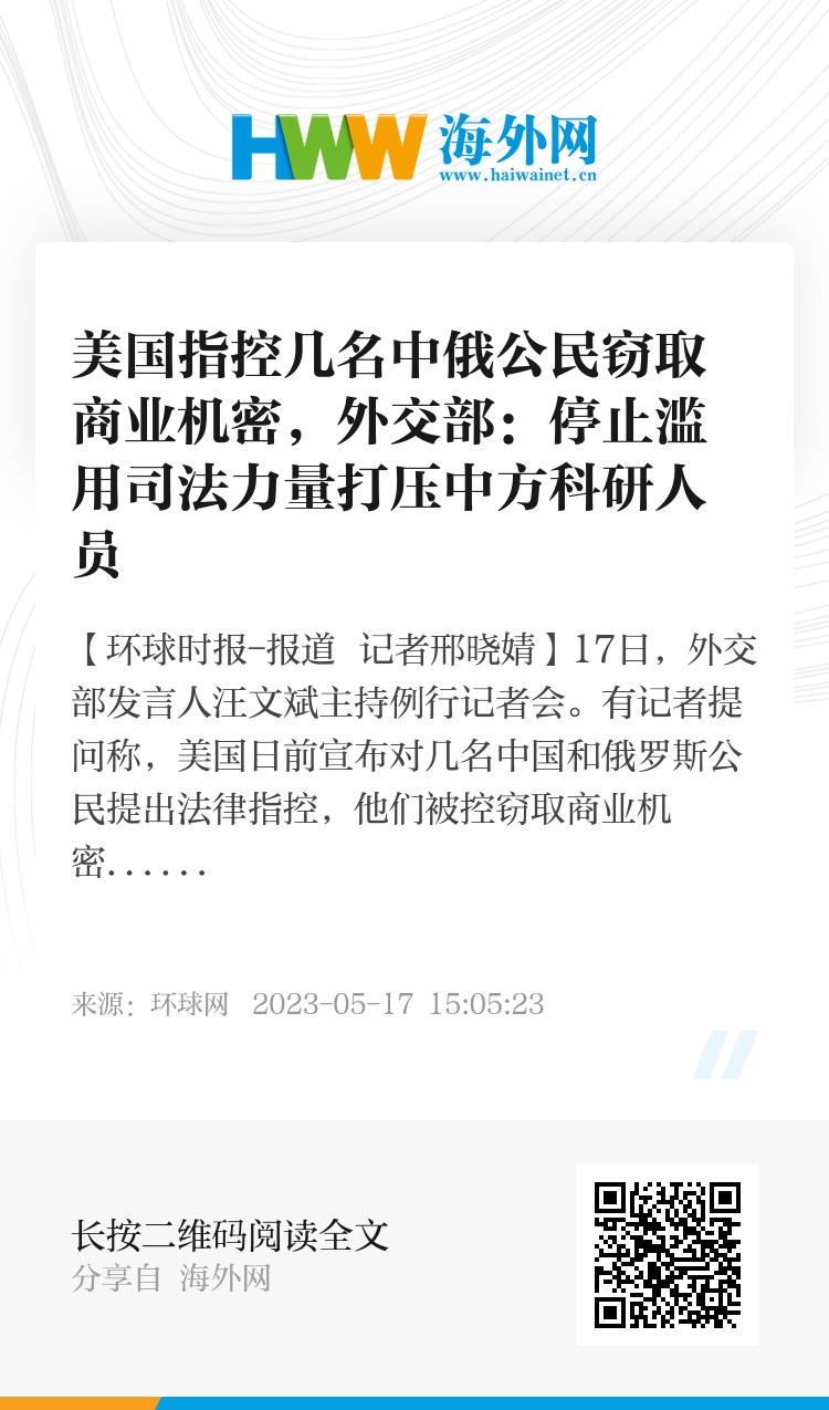【环球时报-环球网报道 记者邢晓婧】17日,外交部发言人汪文斌主持例行记者会。有记者提问称,美国日前宣布对几名中国和俄罗斯公民提出法律指控,他们被控窃取商业机密,并试图违反制裁规定出口敏感技术,其中一位中国公民此前在苹果公司担任软件工程师。中方对此有何评论?
