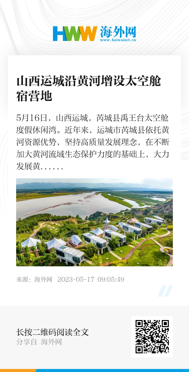 5月16日,山西运城,芮城县禹王台太空舱度假休闲湾。近年来,运城市芮城县依托黄河资源优势,坚持高质量发展理念,在不断加大黄河流域生态保护力度的基础上,大力发展黄河旅游产业,带动当地经济社会的发展。目前,该县沿黄河各大旅游景区内增设的太空舱、宿营地等旅游元素,成为沿黄旅游线上亮丽的名片。图片来源:薛俊/视觉中国