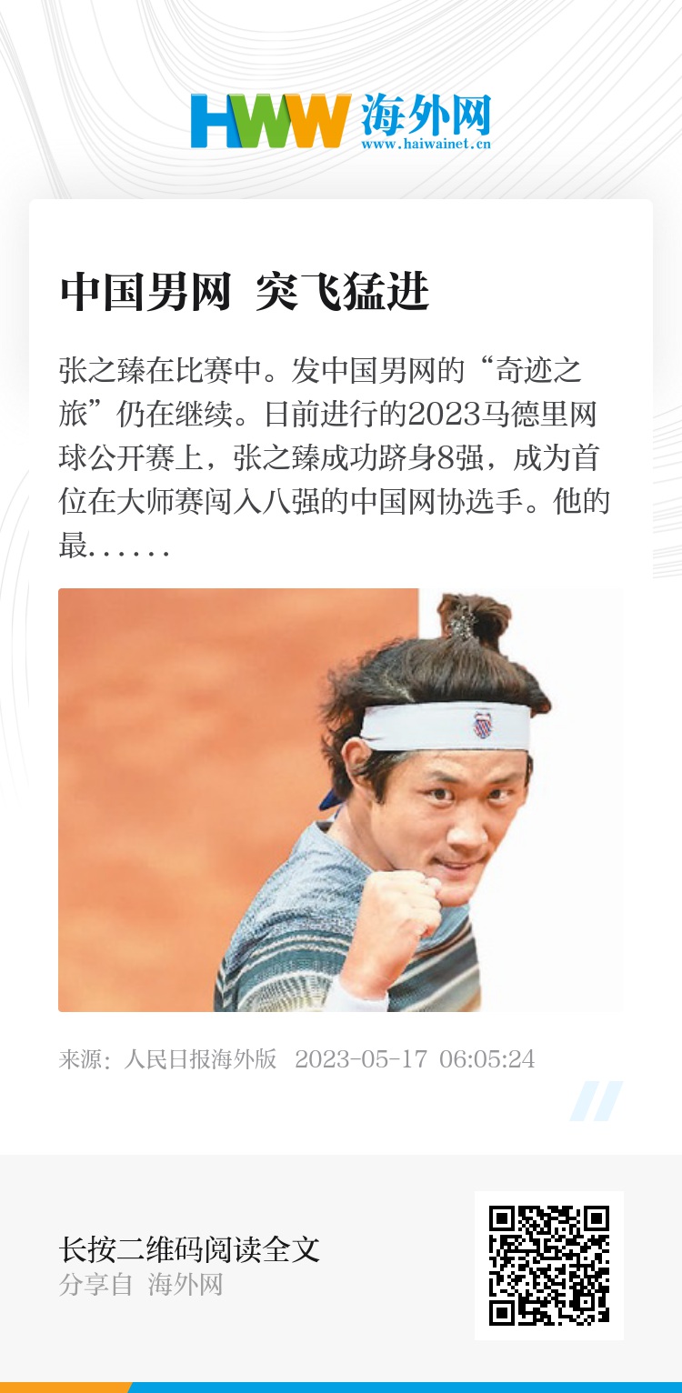 中国男网的“奇迹之旅”仍在继续。日前进行的2023马德里网球公开赛上,张之臻成功跻身8强,成为首位在大师赛闯入八强的中国网协选手。他的最新世界排名也来到第69位,创造个人新高。