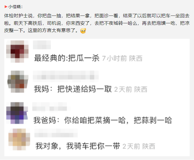 网友眼中的西安人,可以把叠词用到炉火纯青:锅锅、铲铲、盖盖、盒盒、勺勺、盆盆、碟碟、杯杯,他们还是“把”字句狂魔:把馍一掰,把饭一咥,把袄一洗、把班一上……